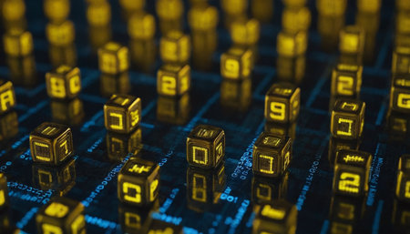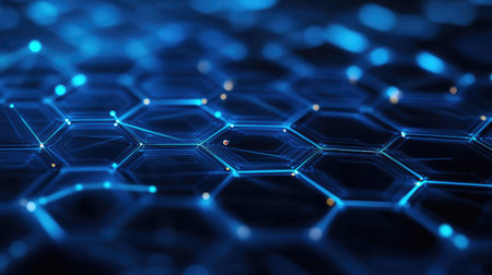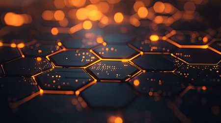 A hightech setting featuring illuminated hexagons and abstract design elements in a futuristic digital theme