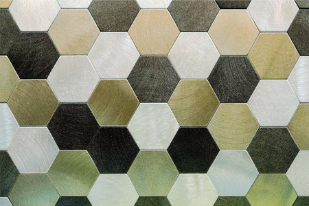 A collection of hexagonal tiles in various colors decorates a wall showcasing a mix of yellow grey and white hues with textures and patterns.