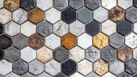 Hexagonal tiles with varied textures and colors, forming an eye-catching mosaic pattern for interior design