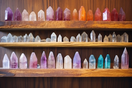 quartz crystals displayed on a wooden shelf, created with generative ai