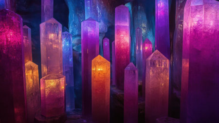 An enchanting display of multicolored crystals rises from the depths of a mystical cave, illuminated by an ethereal glow. The captivating colors create a surreal and magical atmosphere, inviting exploration and wonder.