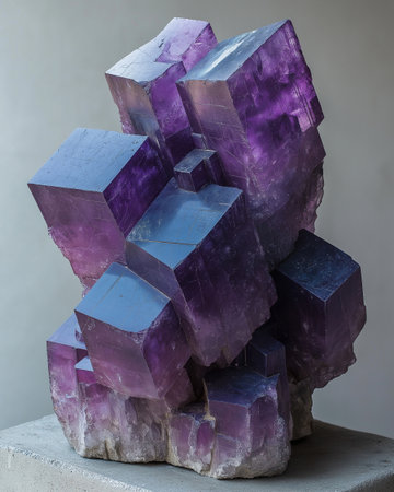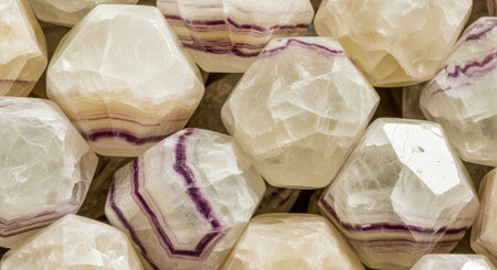 Polished geometric fluorite crystals with natural purple bands and translucent textures arranged closely in a pattern.