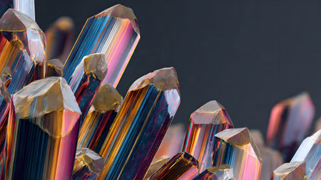 Abstract background featuring a cluster of rainbow-colored crystals. Modern, colorful, and visually striking design element.