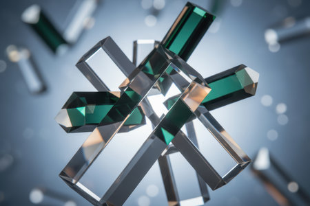 Abstract composition of clear and green geometric glass forms.