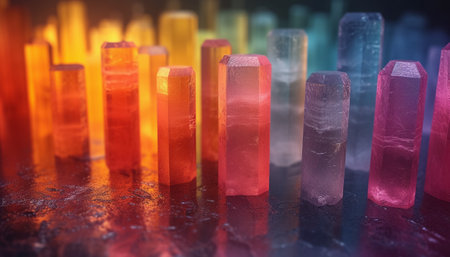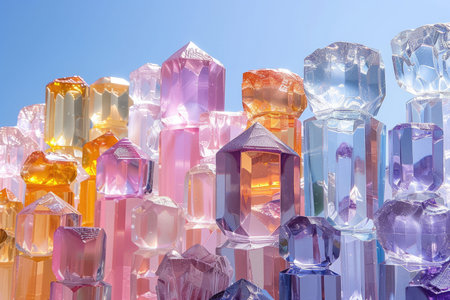 A vibrant arrangement of colorful crystal towers casting beautiful shadows, showcasing light and geometry. Ideal for artistic and decorative themes.