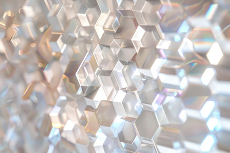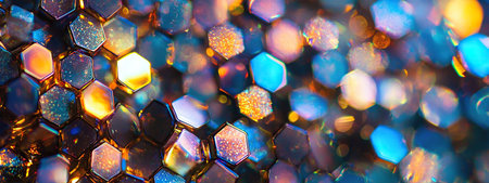Glowing hexagonal grids in metallic and holographic tones create a mesmerizing display