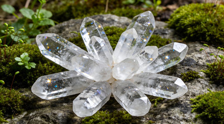 This digital illustration evokes a serene, grounding mood via precise light refraction on facets and lush organic textures, fostering tranquility. Ideal for wellness websites, crystal healing guides, meditation apps, yoga studio visuals, holistic therapy graphics, and spiritual retreat promotions targeting energy workers and mindfulness enthusiasts. Its detailed exec... AI-generated illustration.