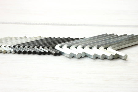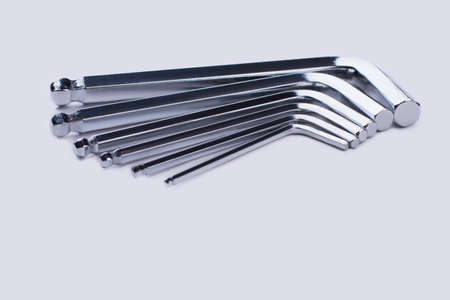 hex key wrench set on white grey background, steel carbon hand tool, repair