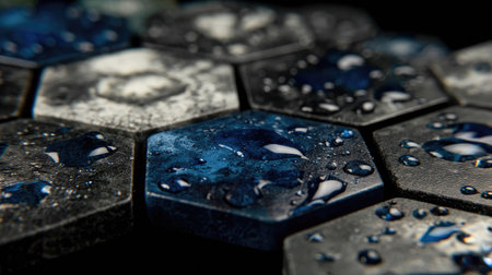 Macro shot of black hexagon with water droplets on it