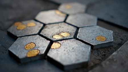 Tight, shallow depth-of-field shot focuses on a cluster of dark, aged hexagonal tiles, each embedded with irregular patches of a contrasting bright, golden-colored material, suggesting an artisan or industrial construction element.