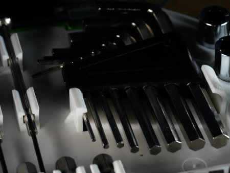 A selective focus shot of a new set of hex keys in a toolbox