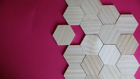 Wooden hexagons on a pink background. The concept of teamwork and cooperation.