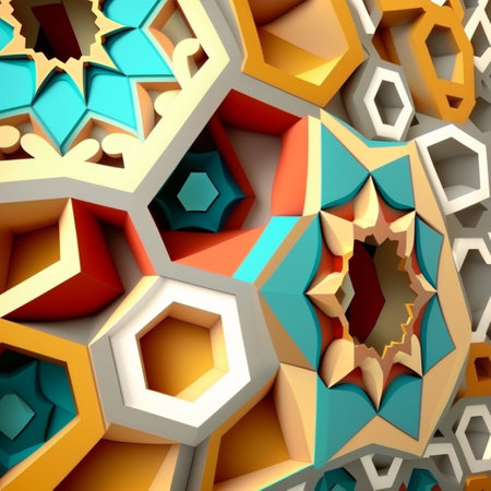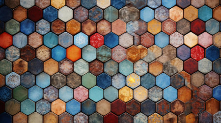 Illustration of a complex pattern of hexagonal tiles arranged in a honeycomb like structure. Each tile features a different geometric design in bold colors, creating a visually stimulating and intricate composition.