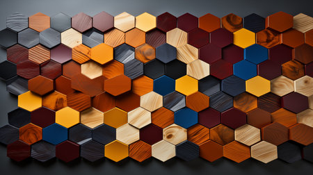 Artistic arrangement of wooden hexagonal tiles featuring a variety of vibrant colors and textures on a dark wooden background. ideal for enhancing interior spaces with a touch of rustic elegance and geometric style. Generative AI