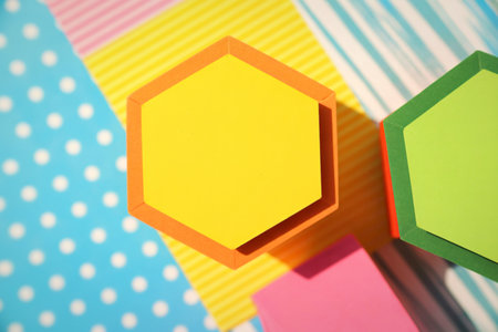 Brightly colored hexagonal shapes are arranged on a backdrop of patterned and textured papers, creating a vibrant and playful composition.