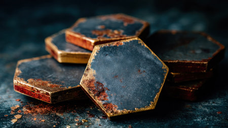 Macro photograph showcases a small pile of hexagonal, dark colored edible pieces, possibly premium chocolates, resting on a textured, dark surface. These pieces have uneven edges highlighted with a metallic gold or copper color, suggesting a high-end or aged aesthetic, with scattered crumbs around the base.