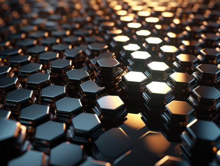 Intricate metallic hexagonal tiles glisten under gentle lighting, showcasing a blend of sharp edges and reflective surfaces that create a captivating visual effect.