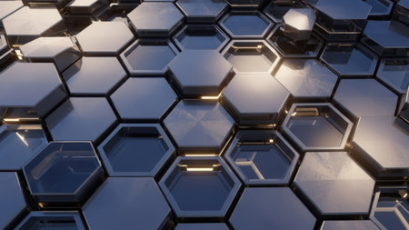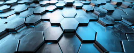 A futuristic metal surface with a repeating pattern of hexagonal tiles, each with a different shade of metallic sheen and glowing blue accents, creating a high-tech feel.