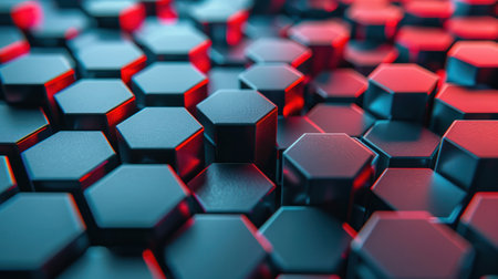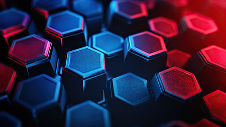 Abstract digital background featuring dark honeycomb hexagons in red and blue, perfect for modern designs.