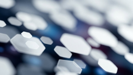 Abstract 3d rendering of chaotic hexagons. Bokeh lights background.