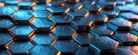 A sleek, futuristic metal surface with hexagonal patterns and a glowing blue underlay, giving it a high-tech, sci-fi feel.