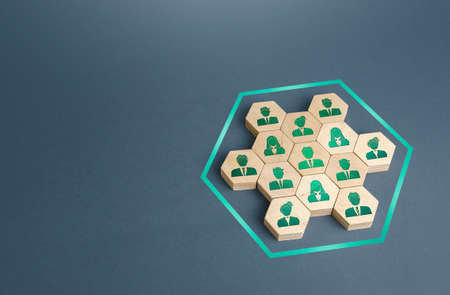 People are united in a group. Consolidation. Joining forces to achieve a common goal. Hiring employees, recruiting staff. Human resources. Grouping, self organization. Social processes.