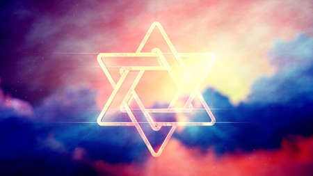 Symbol of Judaism or Star of David. Six-pointed star in a center of composition in beams of the sun.