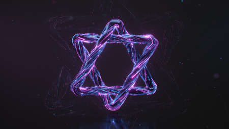 Star of David with neon lights on blue background. 3d render