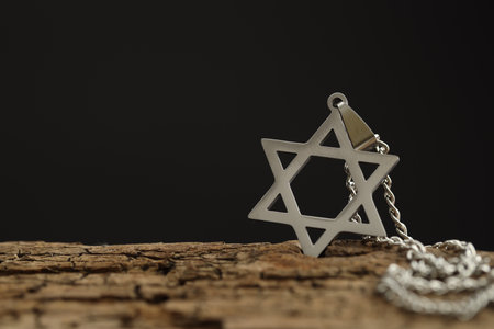 Holocaust Remembrance Day. Pendant in shape of Star of David and metal chain on wooden surface against black background, closeup. Space for text