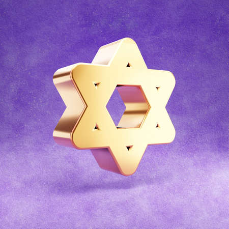 Star of David icon. Gold glossy Star of David symbol isolated on violet velvet background.