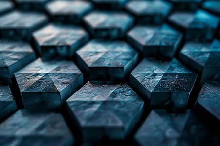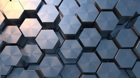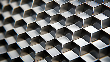Intricate metallic hexagonal tiles glisten under gentle lighting, showcasing a blend of sharp edges and reflective surfaces that create a captivating visual effect.