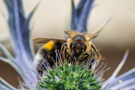 Detailed macro photograph of a bee gathering pollen on a colorful flower in a close up perspective