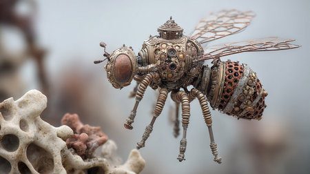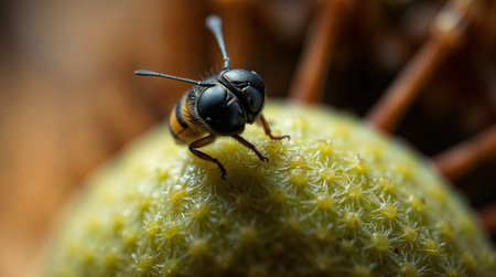 A bee is perched on green foliage collecting pollen while surrounded by vibrant colors. The detailed texture showcases natures beauty in action.