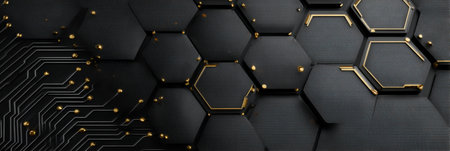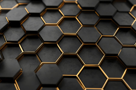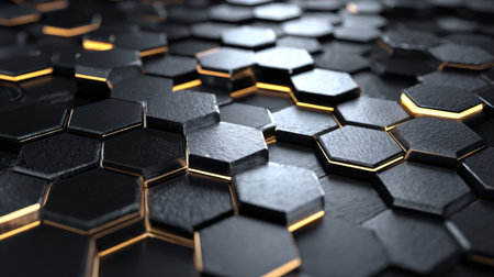A luxurious 3D background with black hexagons embossed on a deep, velvety surface. The golden metallic edges of each hexagon add a premium, high-end aesthetic, making the scene ideal for elegant branding, luxury products, and sophisticated presentations.