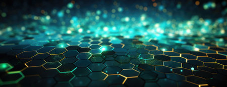 blue and green hexagonal structure with technology concept, in the style of light black and dark aquamarine, numerical complexity