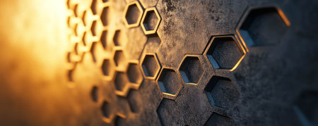Hexagonal mesh texture on textured wall with warm lighting for architectural design
