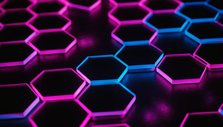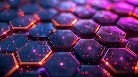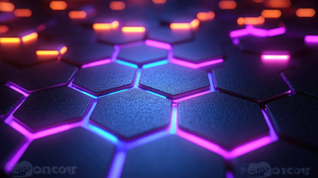 This image showcases a close-up of a digital hexagonal structure. The artwork features a gradient of colors including blue, purple, and orange. The composition highlights a pattern of interlocking shapes and neon lights. Ideal for representing technology, data, or modern design concepts, it could be used for various editorial or commercial projects.