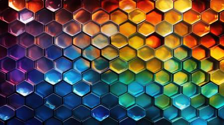 Futuristic hexagonal patterns with vibrant colors and reflective surfaces create a mesmerizing texture, evoking a sense of modernity and innovation. Perfect for your digital vision board. Generated A.I.
