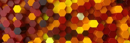 3d illustration of a yellow and orange honeycomb monochrome honeycomb for honey. Pattern of simple geometric hexagonal shapes, mosaic background. Bee honeycomb concept, Beehive