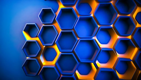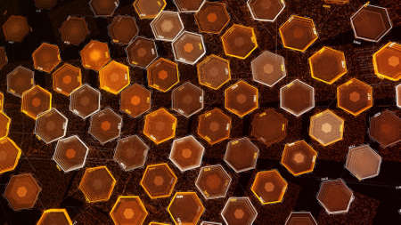 The composition features a close-up view of a hexagonal pattern with glowing orange edges against a dark background, evoking a modern and technological atmosphere.