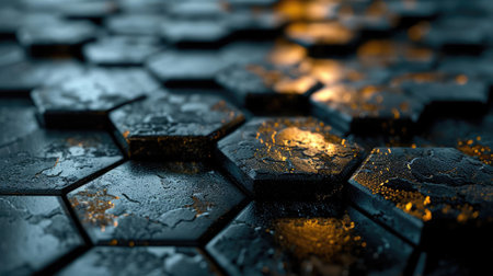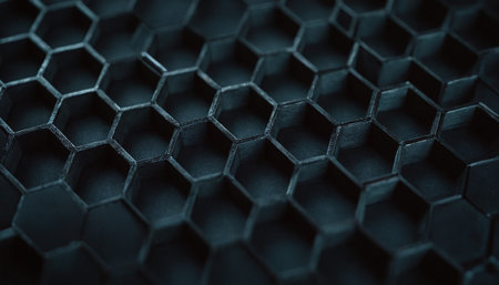 Abstract geometric design featuring a dark hexagonal pattern with intricate textures, creating a visually striking depth effect.