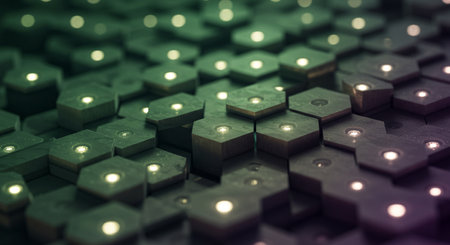 A metallic surface with a repeating pattern of hexagonal tiles, each with a different shade of metallic sheen and glowing blue accents, creating a high-tech look.