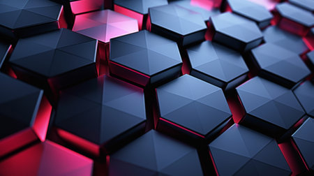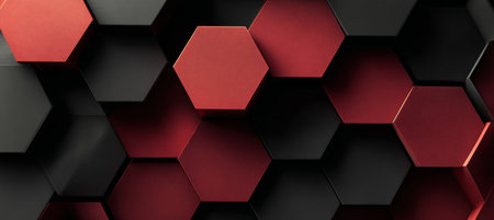 Modern geometric design featuring 3D hexagonal shapes with a red glow, creating a sleek and futuristic abstract pattern.