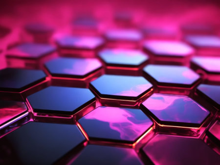 This digital artwork features a vibrant hexagonal pattern with an alluring neon glow, creating a futuristic surface full of colors and reflections.