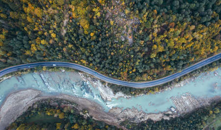 Mountain turquoise river, rocky banks aerial view. Drone shooting. Katun River, Altai
