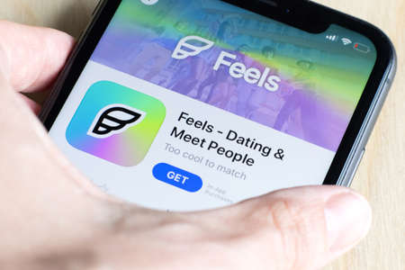 Los Angeles, California, USA - 17 January 2020: Mobile phone in hand with happn Dating app logo on screen close-up, Illustrative Editorial.