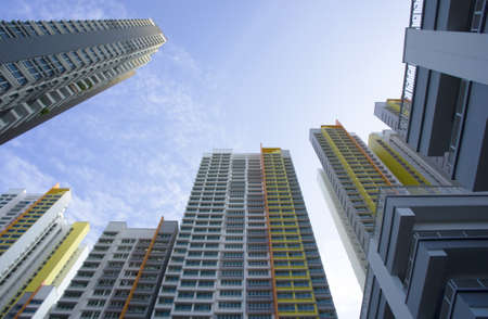 Resident apartment buildings against blue sky. Real estate background