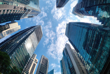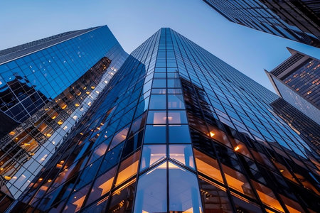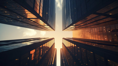 An upward perspective captures the geometric forms of skyscrapers against a vibrant blue sky. Reflective surfaces of the buildings interact with natural sunlight. The image showcases architectural design, and could be utilized for commercial applications. The composition emphasizes the contrast between buildings and sky.