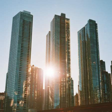 Tall skyscrapers with glass facades glisten in bright sunlight, showing modern architecture in a bustling urban environment. The blue sky complements the scene.