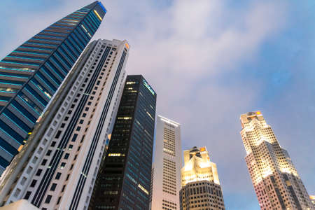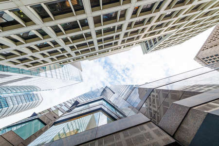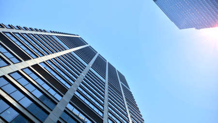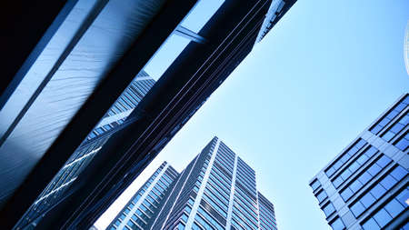 Bottom view of modern skyscrapers in business district against blue sky. Looking up at business buildings in downtown.